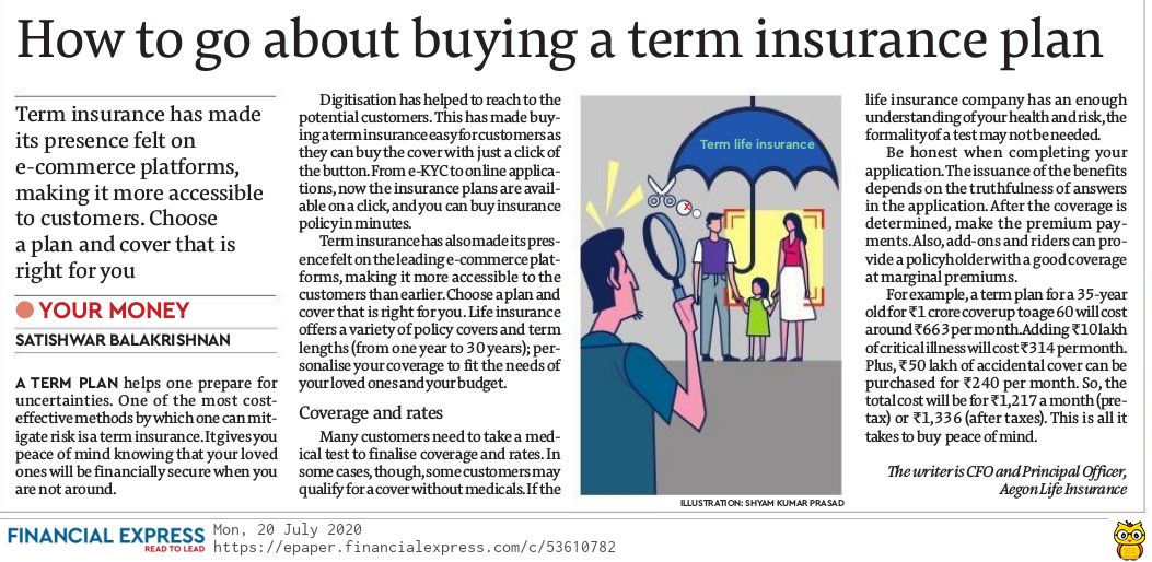 Buy a cover that continues till the time you are 60-65 years old. Also, make sure that you calculate your insurance needs carefully before deciding on the insurance amount. Take into account inflation as well as your other expenses and outstanding loans. Sanjay Tiwari, vice-president, strategy & product, HDFC Life, suggests the use of insurance calculators. These are easily available on the websites of companies and tell you how much insurance you need depending on your income and other factors, such as age.